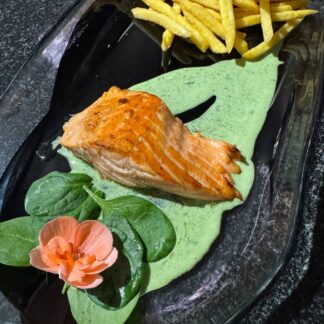 Филе форели со сливочно-шпинатным соусом красной икрой и картофелем фри 400гр