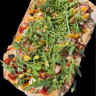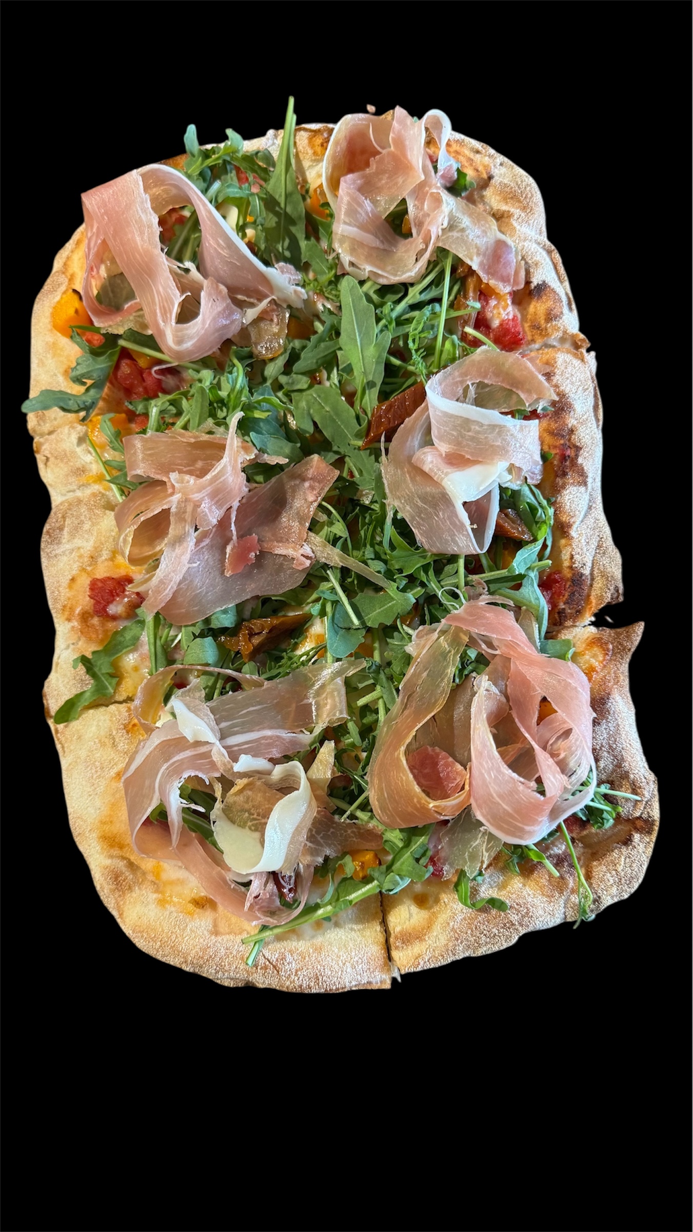 Томатный фреш соус, сыр моцарелла, хамон, карамелизированная тыква, вяленые томаты, руккола. 470 гр