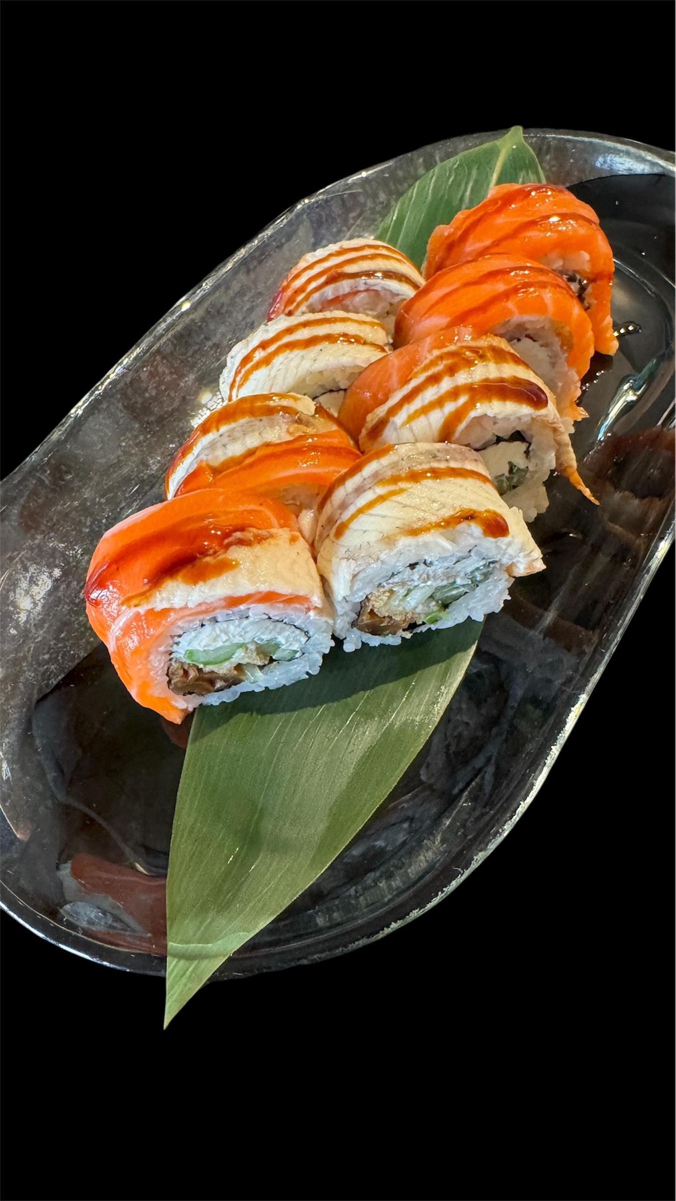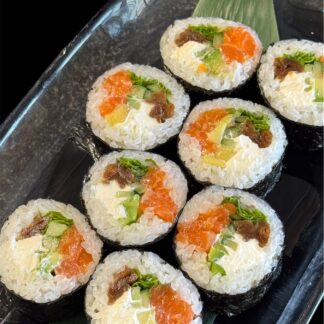 Рис, нори, сыр креметте, угорь, лосось, спаржа панко, тыква канпио, огурец, тобаско. 295гр