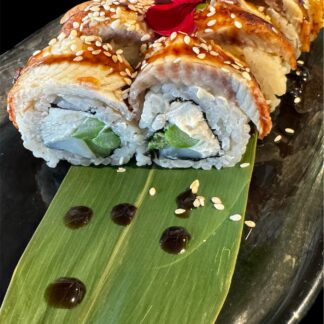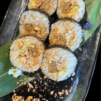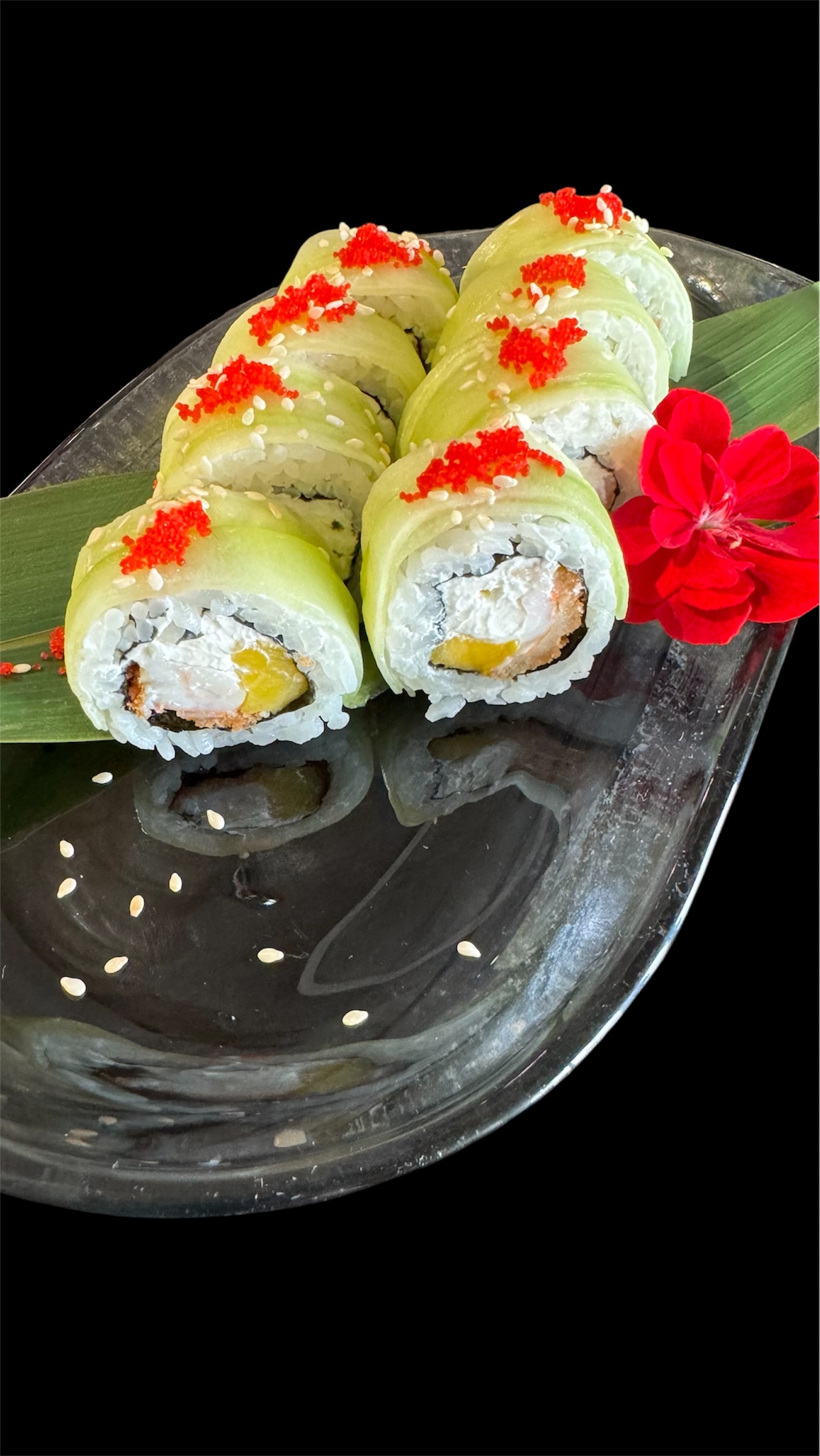 Рис, нори, сыр креметте, креветка темпура, манго, огурец, кунжут, тобико. 255гр