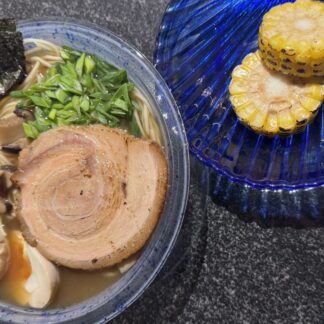 Лапша (handmade) , соус из печеных перцев, мякоть бедра, кокосовый крем, лук зеленый . стружка тунца, брокколи, икра, маринованы желток. 350гр